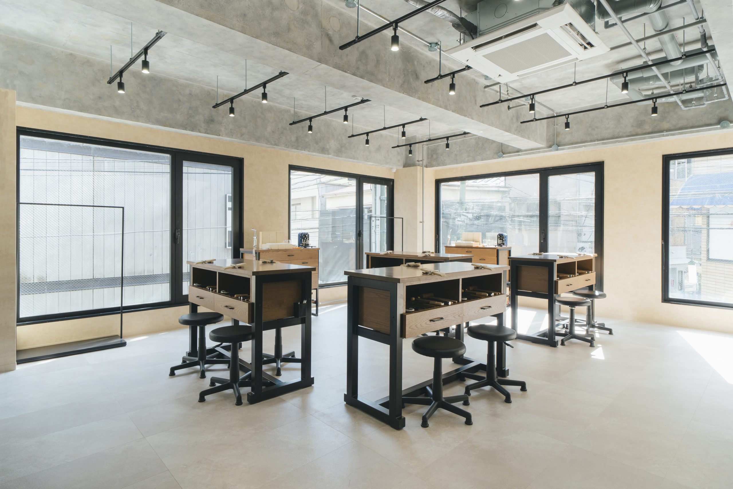 新店舗の内装は、木の質感と柔らかな光が調和するシンプルで洗練された空間です。 大きな窓から自然光が差し込み、制作スペース全体が明るく包まれています。