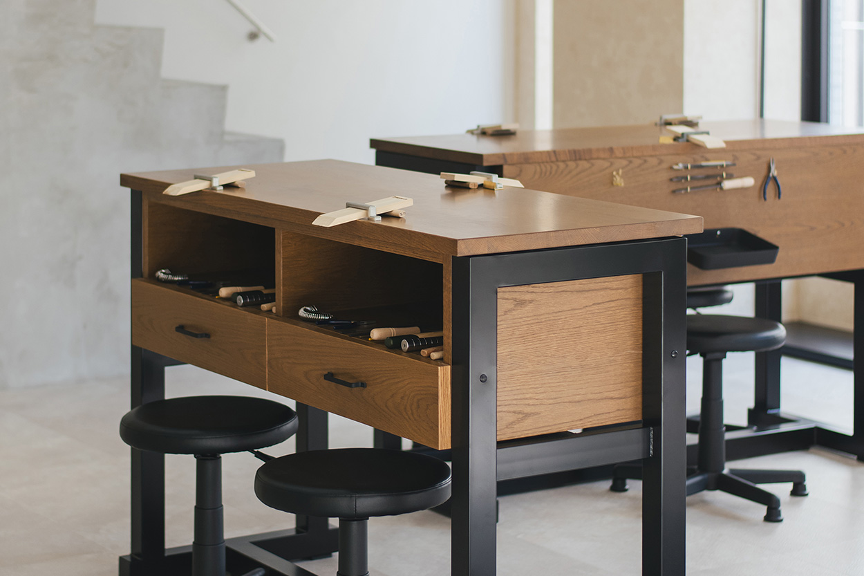 作業台はゆとりをもって配置。静かで落ち着いた雰囲気の中、お二人のペースで、世界に一つだけの指輪をじっくりと形にしていただけます。
