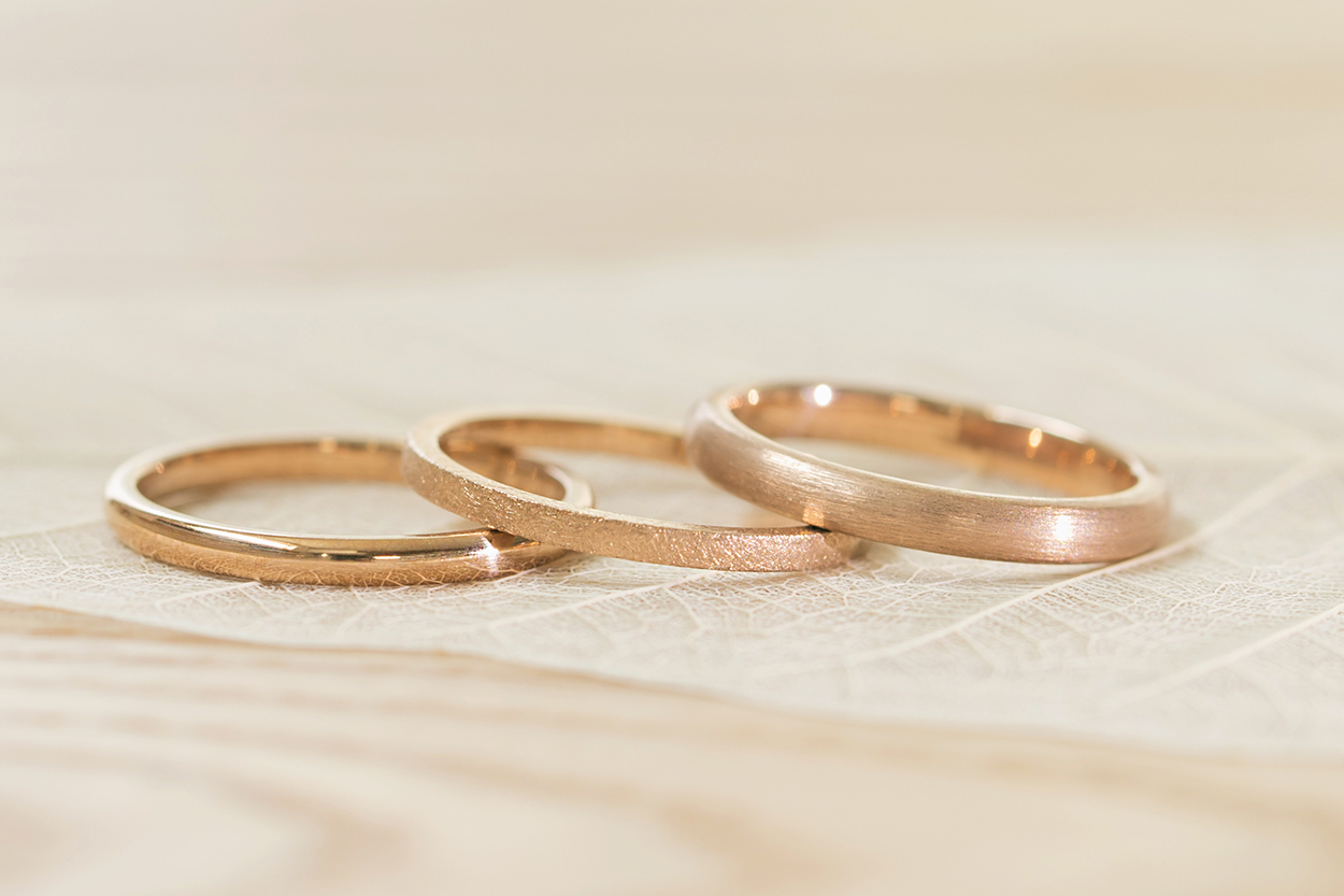 同じピンクゴールドでも、仕上げを変えるだけで一人ひとりの好みに合わせた表現ができるのが、手作りの醍醐味です。