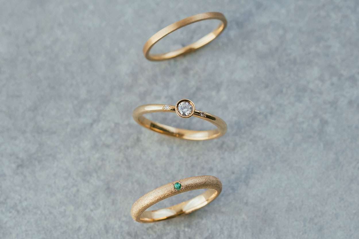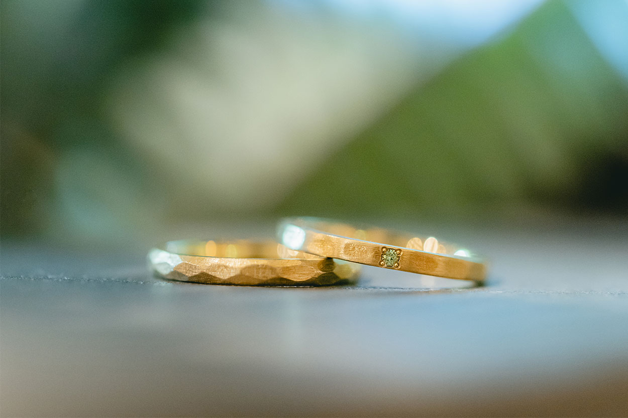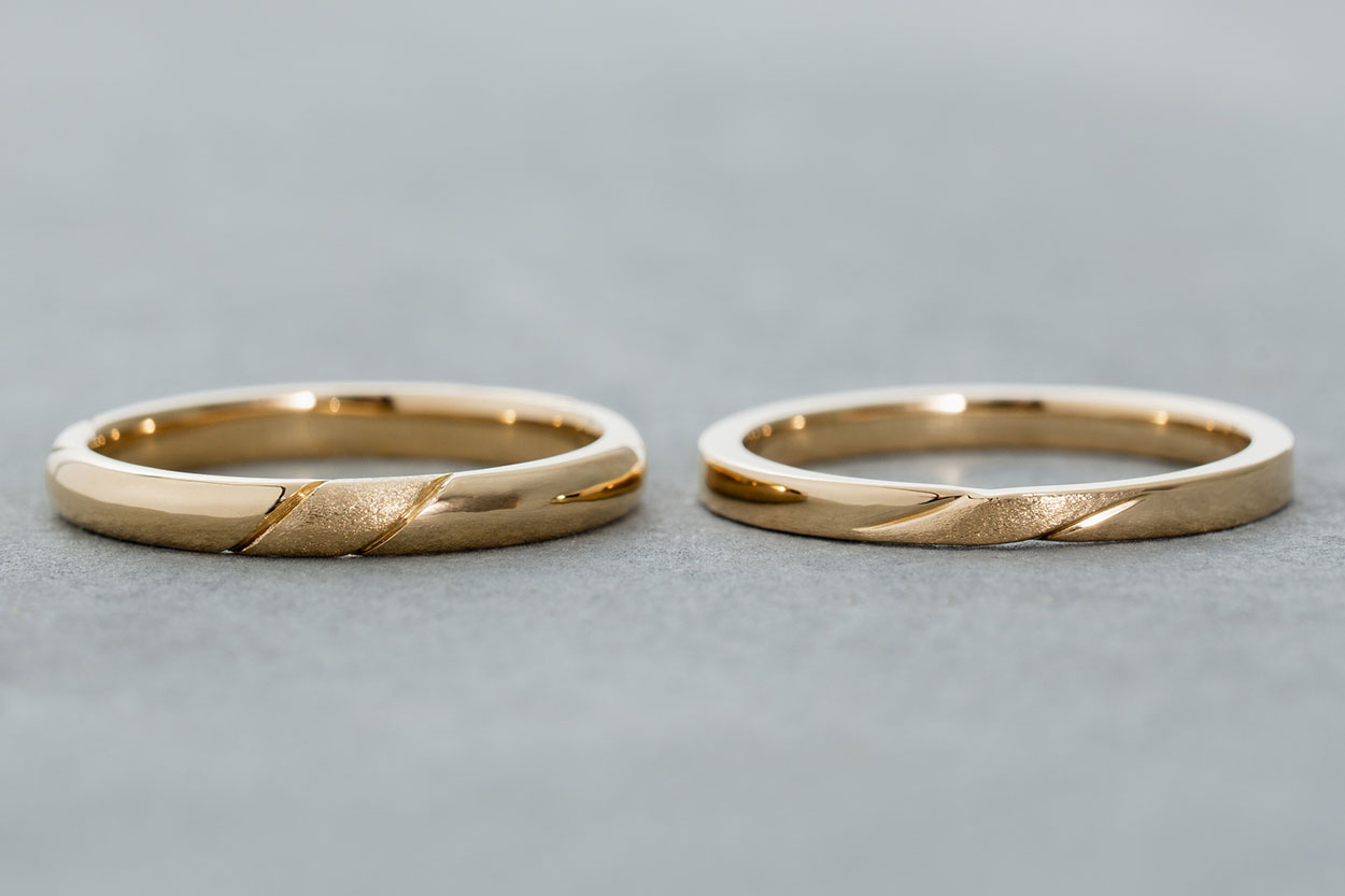 同じイエローゴールドでも、仕上げを変えることで、お二人それぞれの個性を自然に表現できるのが、手作りの魅力です。