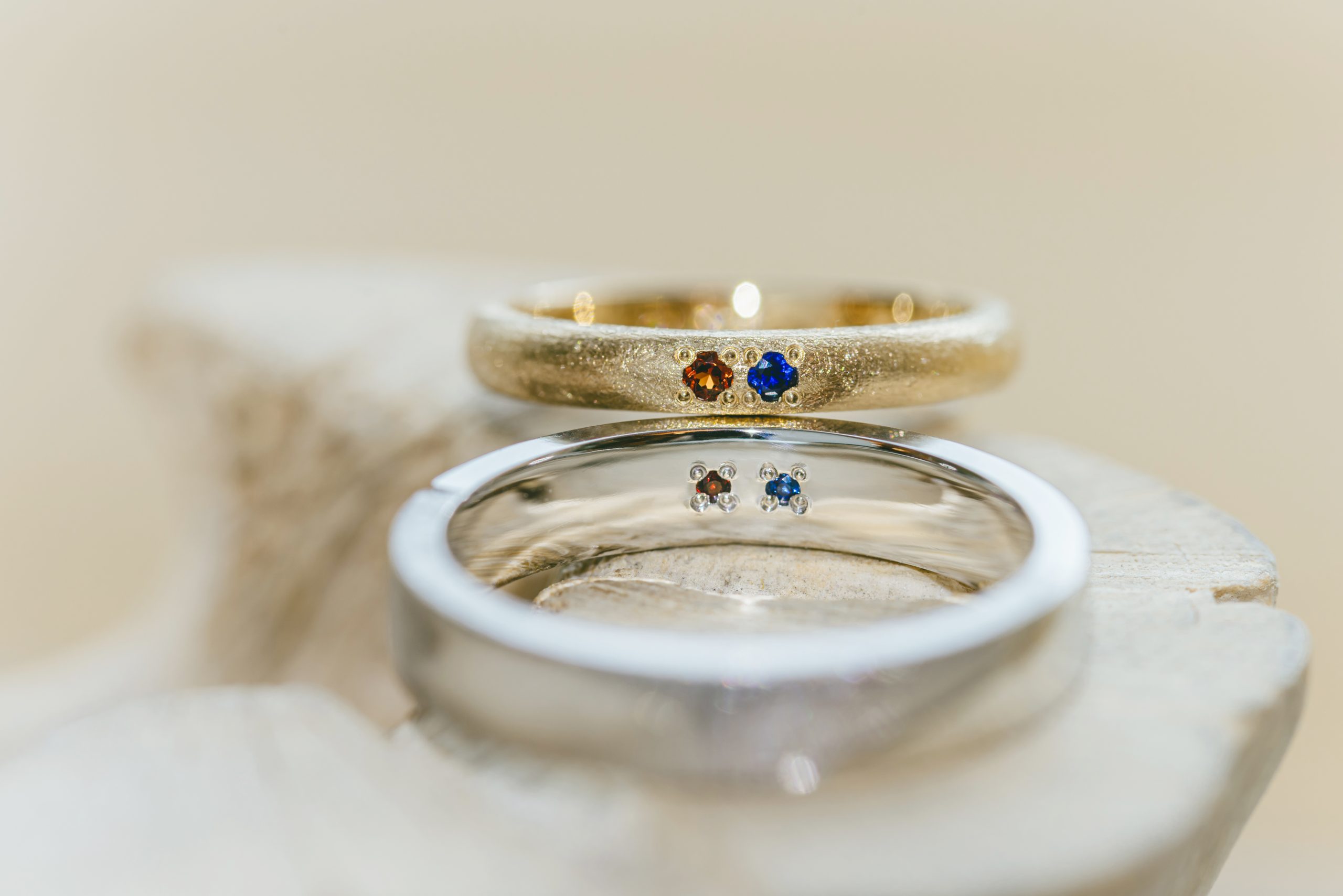 自分の誕生石を入れるのはもちろん、お相手さまの誕生石を交換して入れたり、入籍月の石を選んだり。指輪の内側にきらりと光る石は、お二人だけが知る特別な「お守り」のような存在になります。