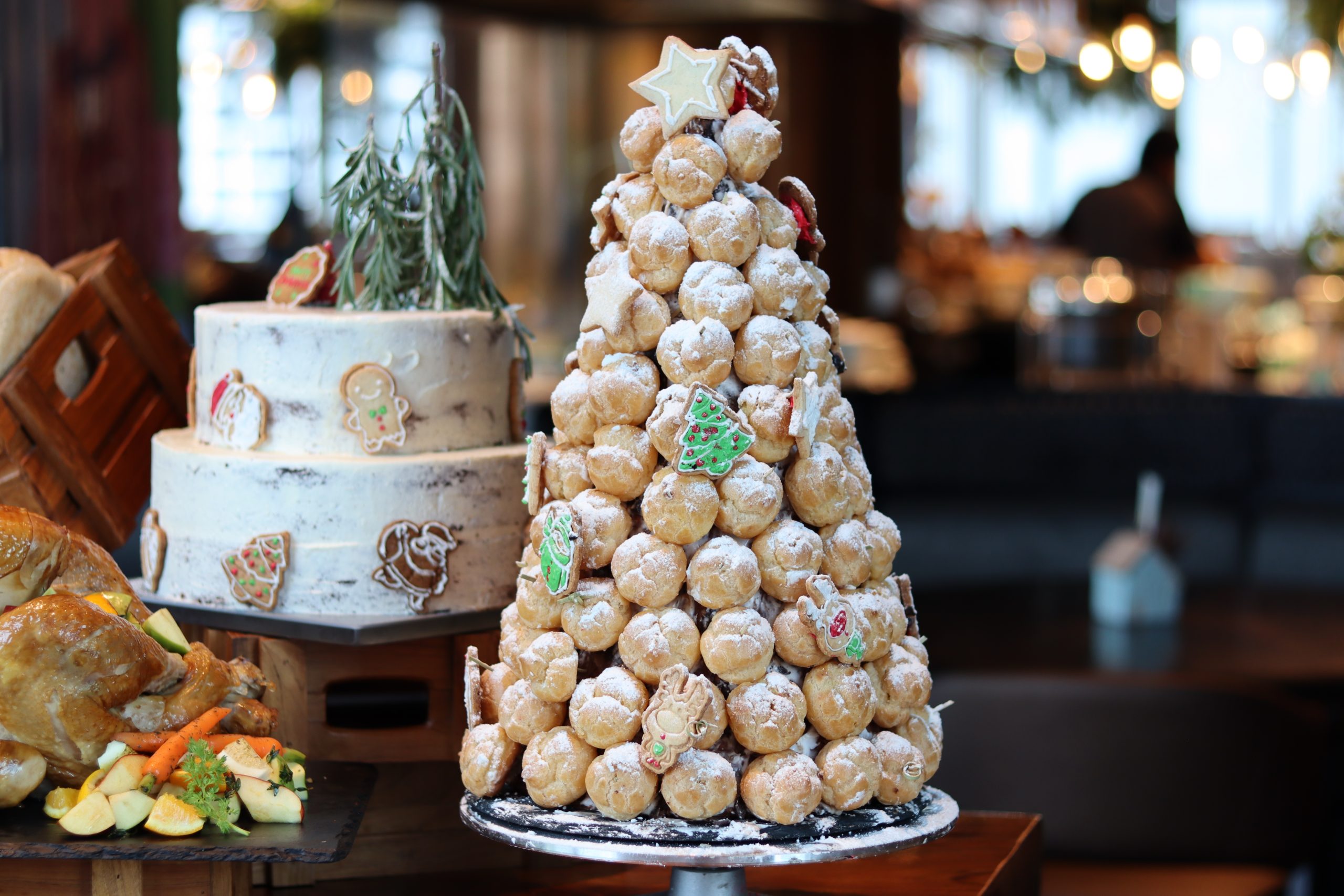 まずご紹介するのは、未完成のケーキや「クロカンブッシュ(小さなシュークリームを積み上げたケーキ)」に、お二人が仕上げを行う演出です。