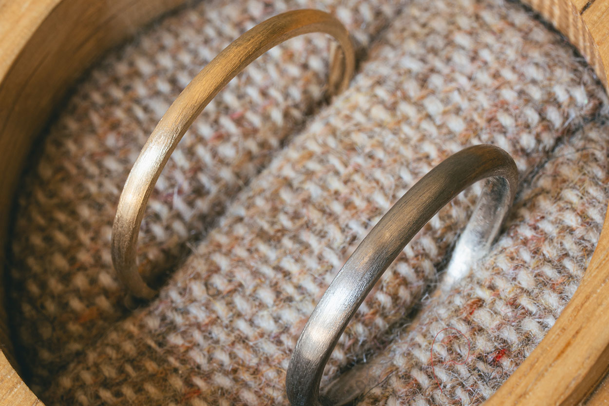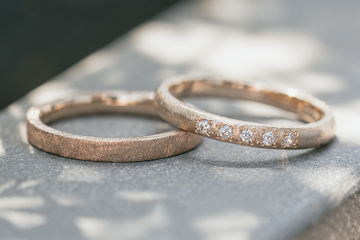 「落ち着いた質感が好き」「普段のファッションに自然になじませたい」というお二人に支持されているのがマット仕上げです。指輪の表面に細かいキズを刻むことで、光の反射を抑えた加工です。