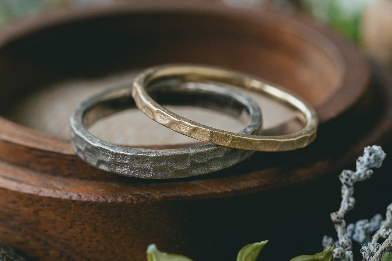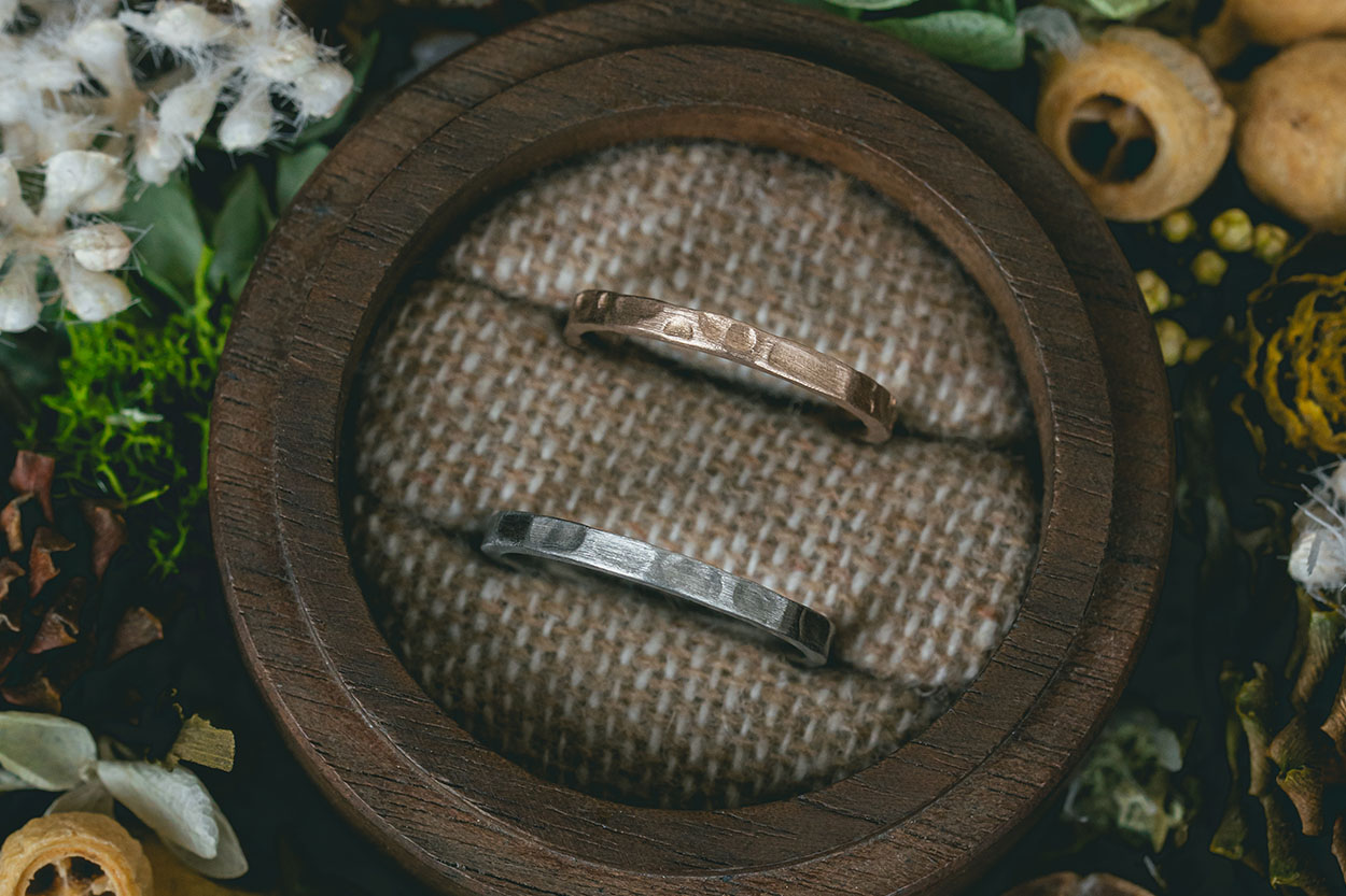 「つちめ」とは、タガネという専用の道具で金属を叩いて入れる模様のことです。お二人がご自身の手で一打一打打ち込むこのデザインは、手作り指輪の醍醐味がぎゅっと詰まっています。