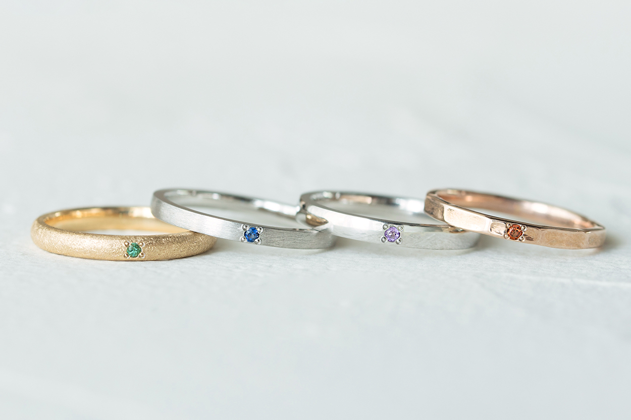 結婚指輪は、お二人にとって一生に一度の特別な宝物。シンプルに素材の美しさを楽しむのも素敵ですが、内側や表面に「誕生石」を添えることで、より深い意味と彩りを持たせることがで