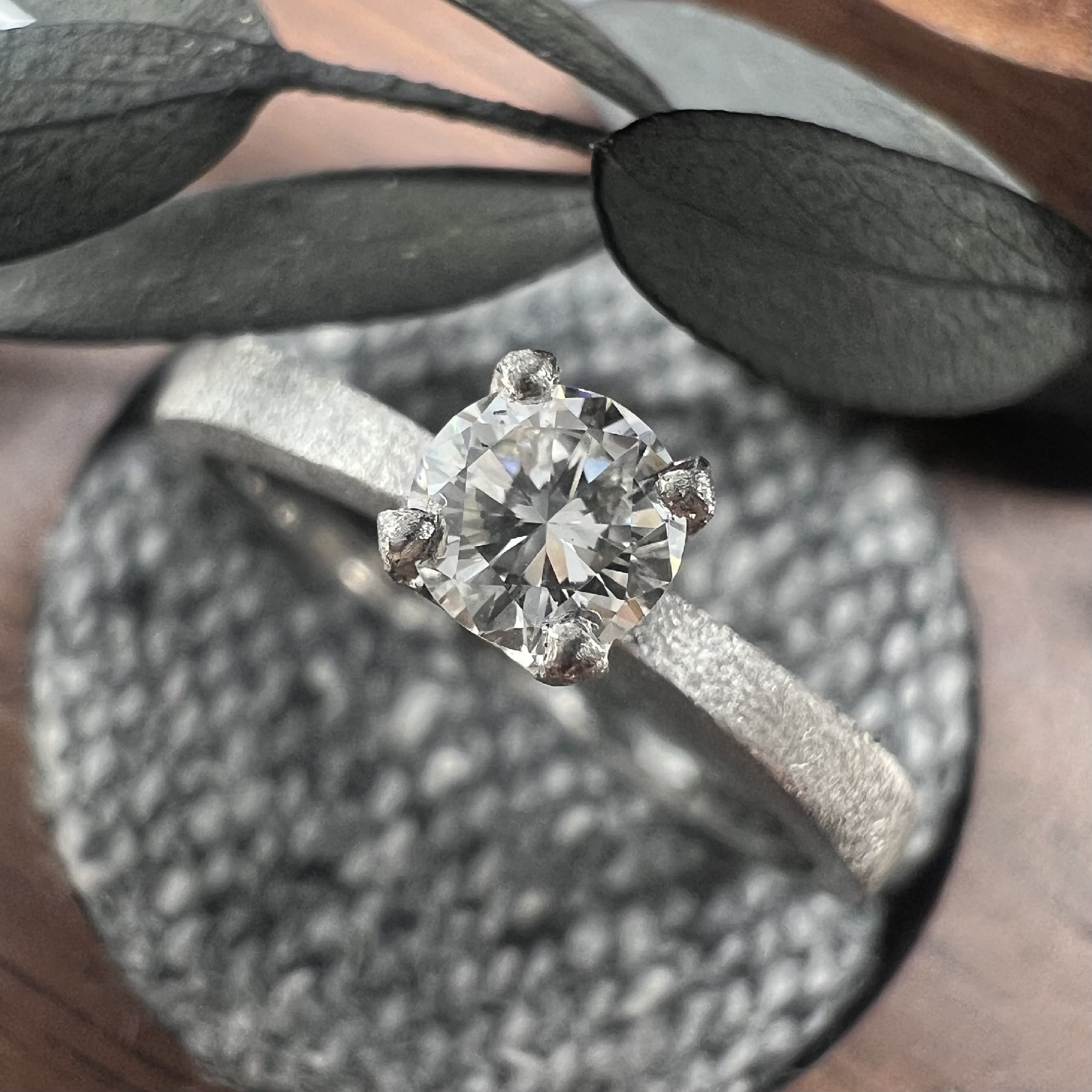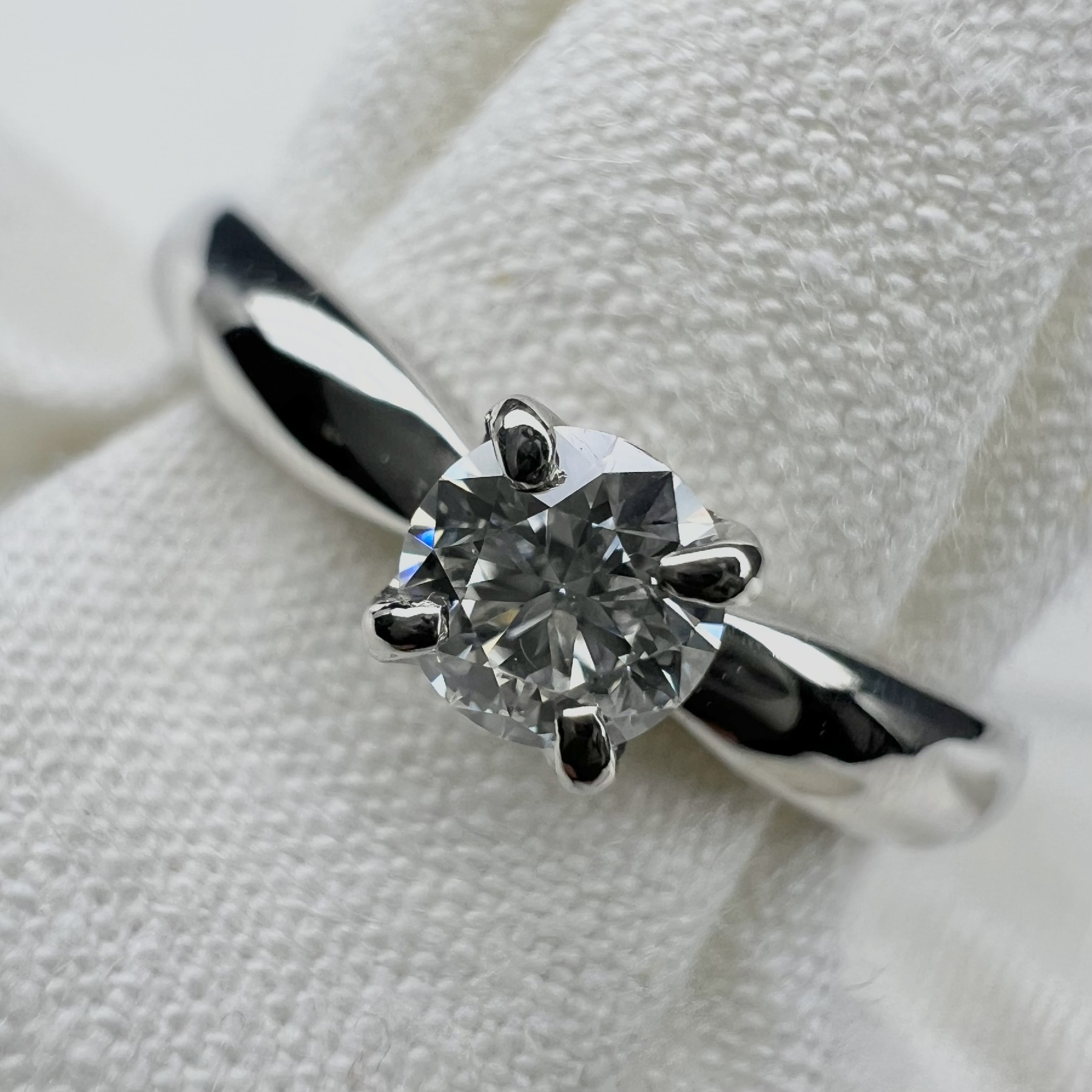 爪を使ってダイヤを固定します。ダイヤを最も美しく見せる留め方とされ、婚約指輪の王道のデザインとして知られます。