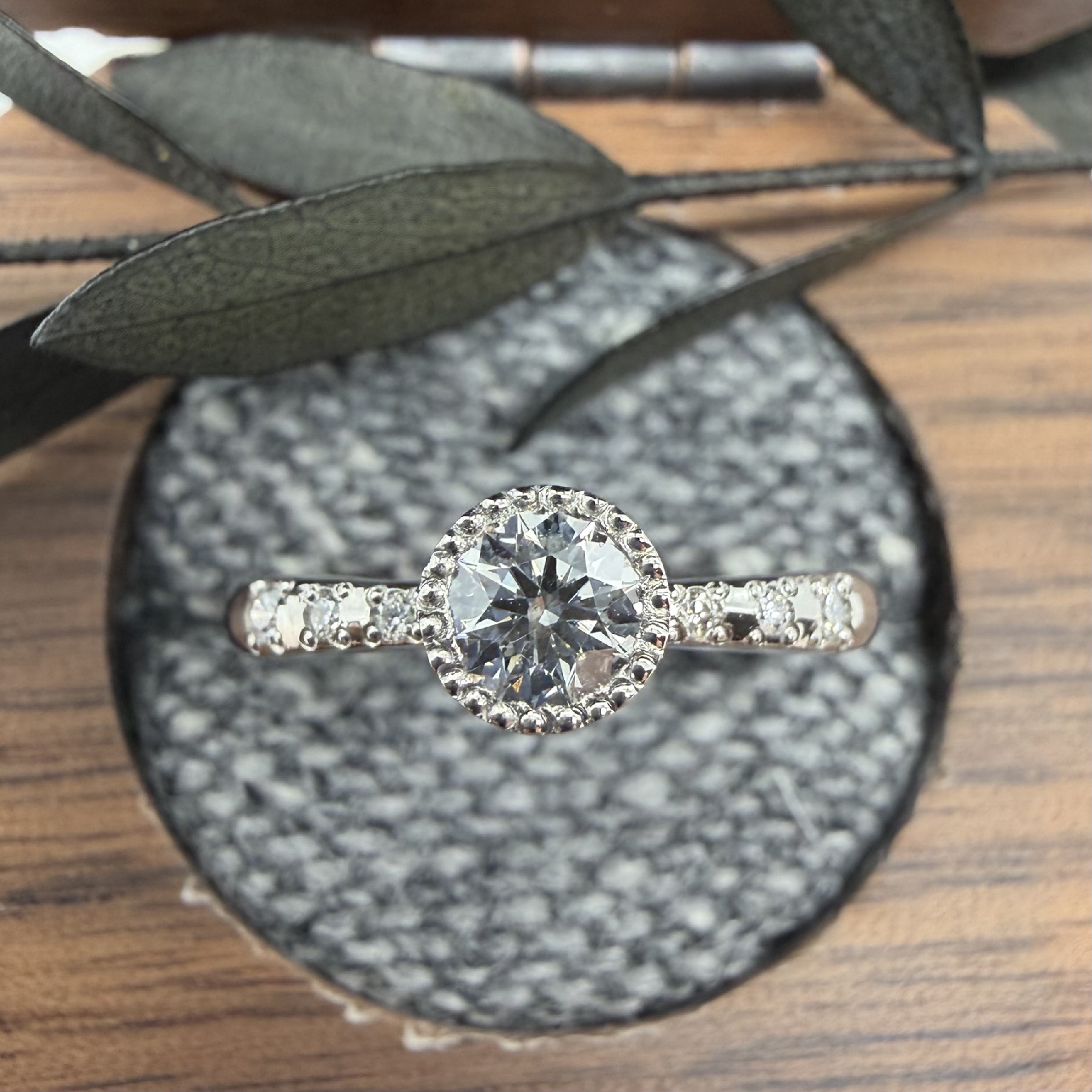 細かな玉模様を彫り入れたミル枠でダイヤを固定します。キュートでゴージャスな印象を与えてくれるデザインです。