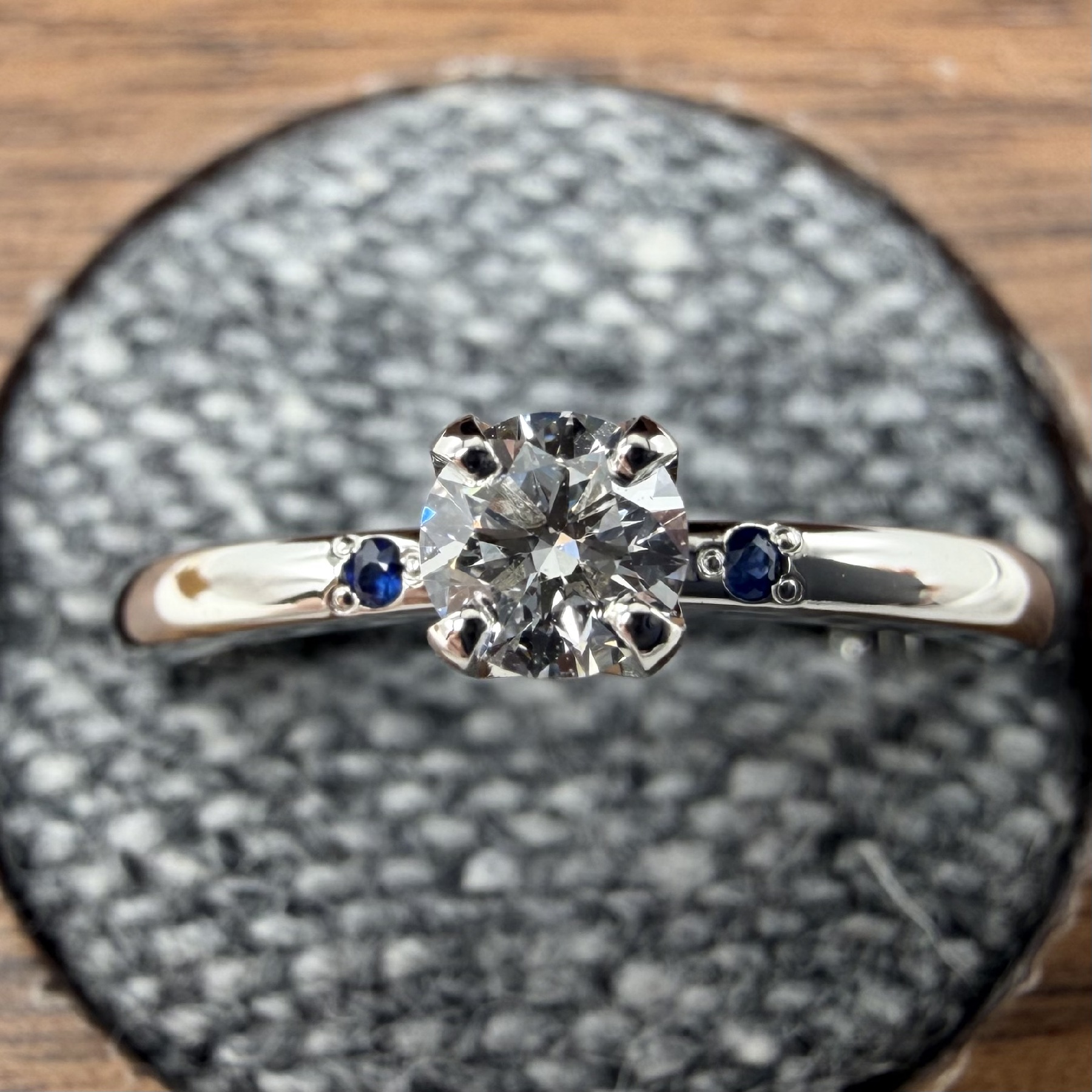 爪を使ってダイヤを固定します。ダイヤを最も美しく見せる留め方とされ、婚約指輪の王道のデザインとして知られます。