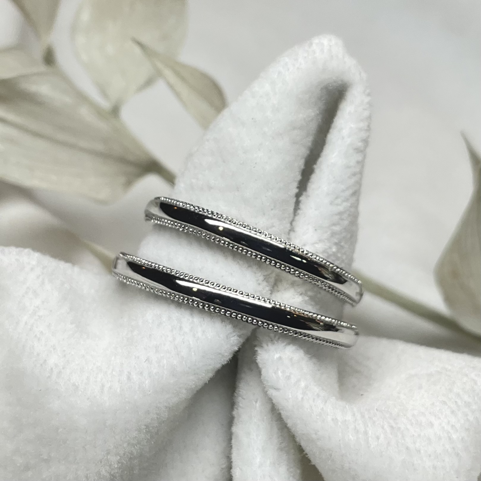 クラシカルでゴージャスな印象を与える、リングの縁や中央部分に小さな粒状の装飾を施したデザイン。