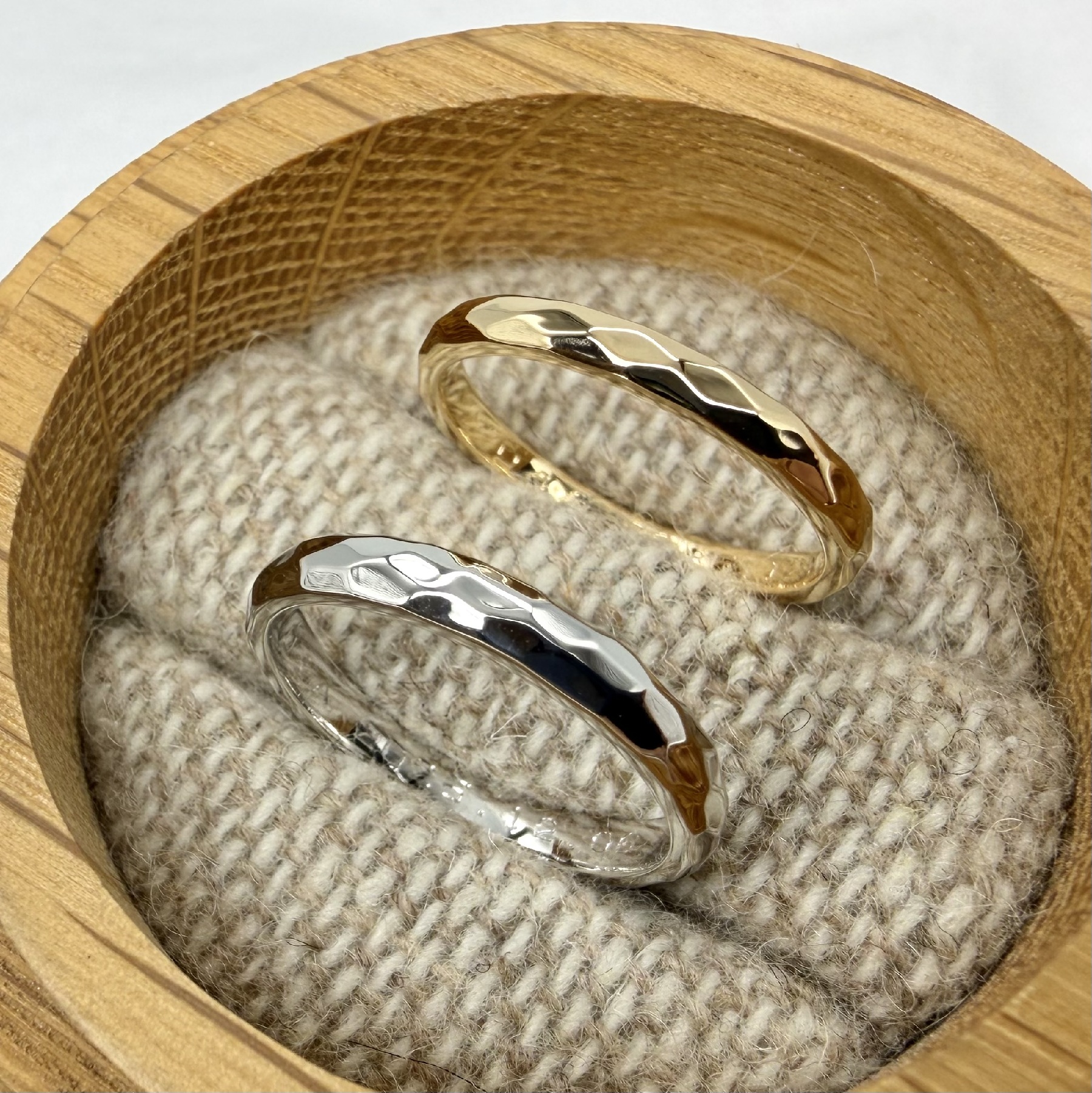 指輪の表面を鏡面のようにキラキラに磨き上げる王道の仕上げ。磨きの工程は大変ですが、その分達成感はひとしおです。