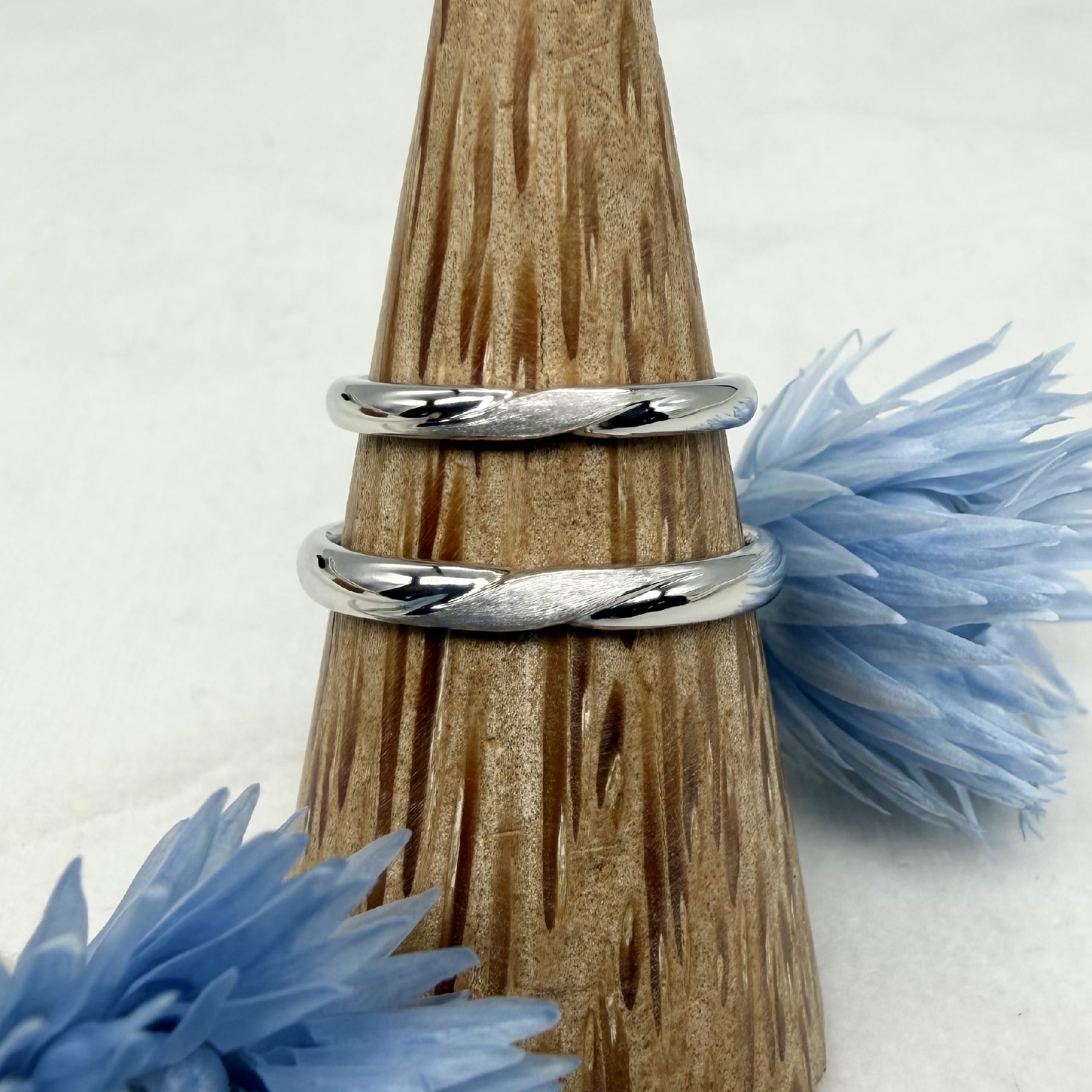 地金をクロスしているように削り出します。流れるようなラインで華麗な印象に。19,800円(税込)
