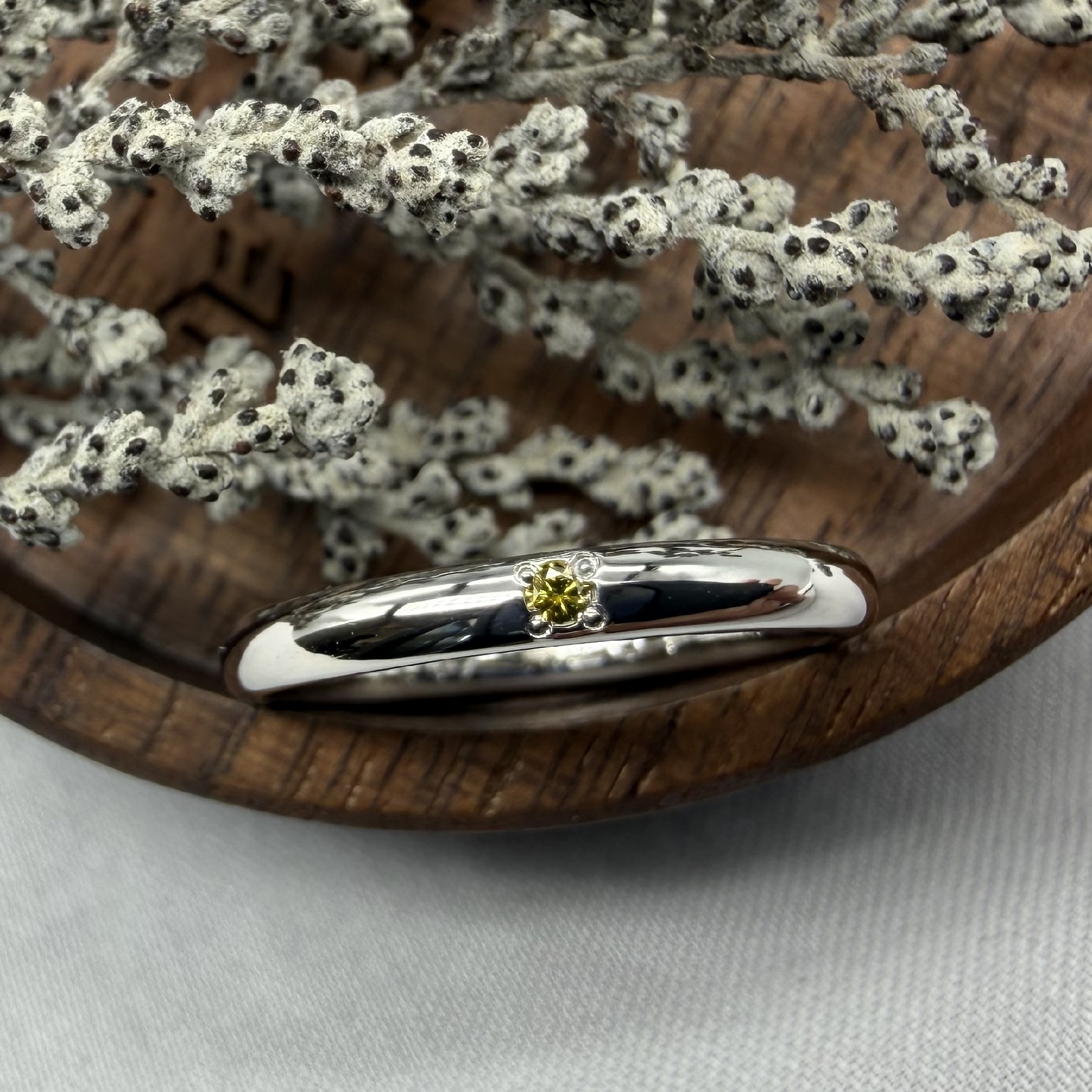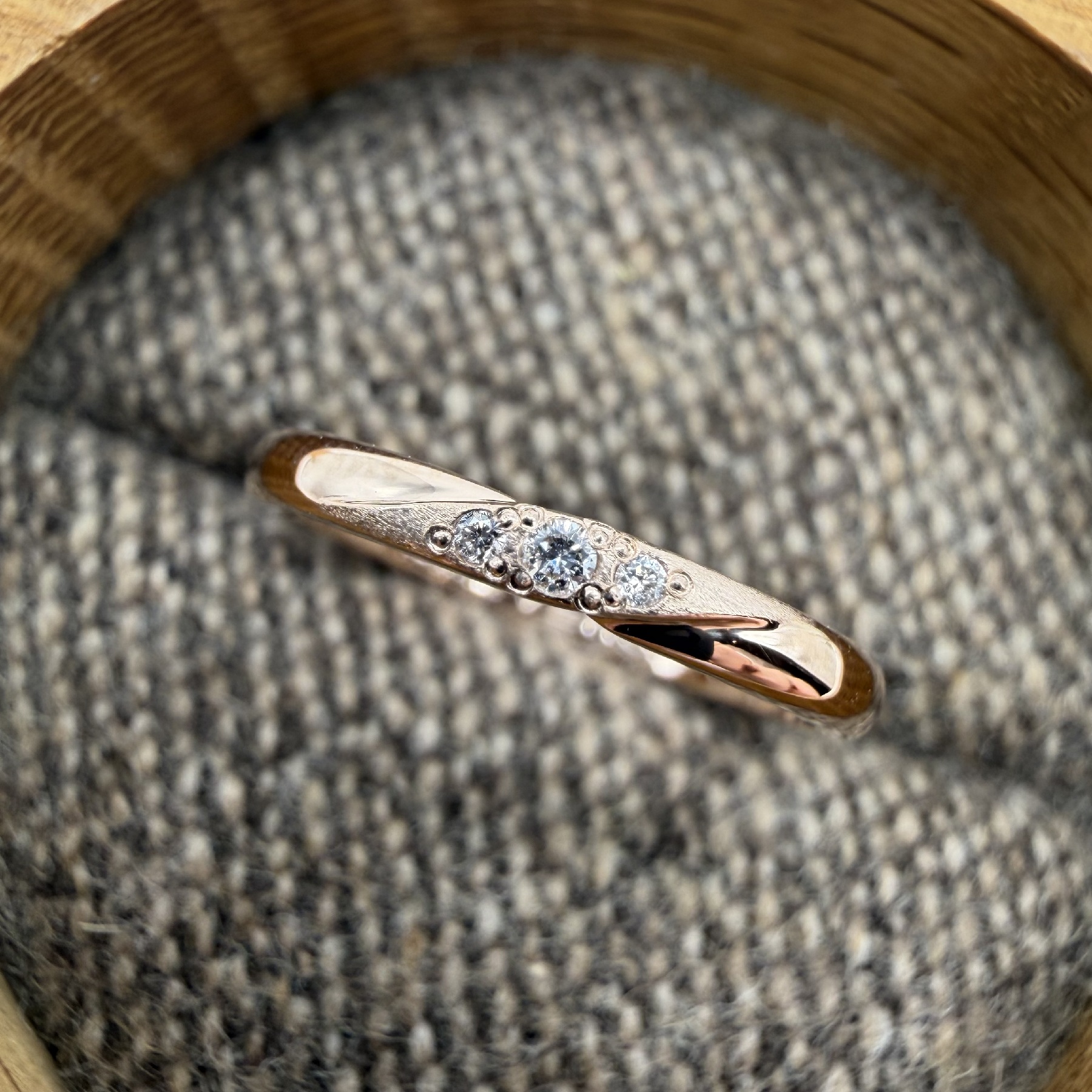指輪の表面を鏡面のようにキラキラに磨き上げる王道の仕上げ。磨きの工程は大変ですが、その分達成感はひとしおです。