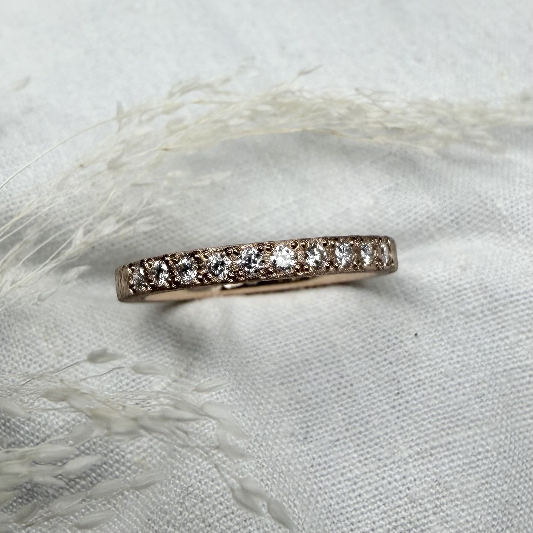 クラシカルでゴージャスな印象を与える、リングの縁や中央部分に小さな粒状の装飾を施したデザイン。