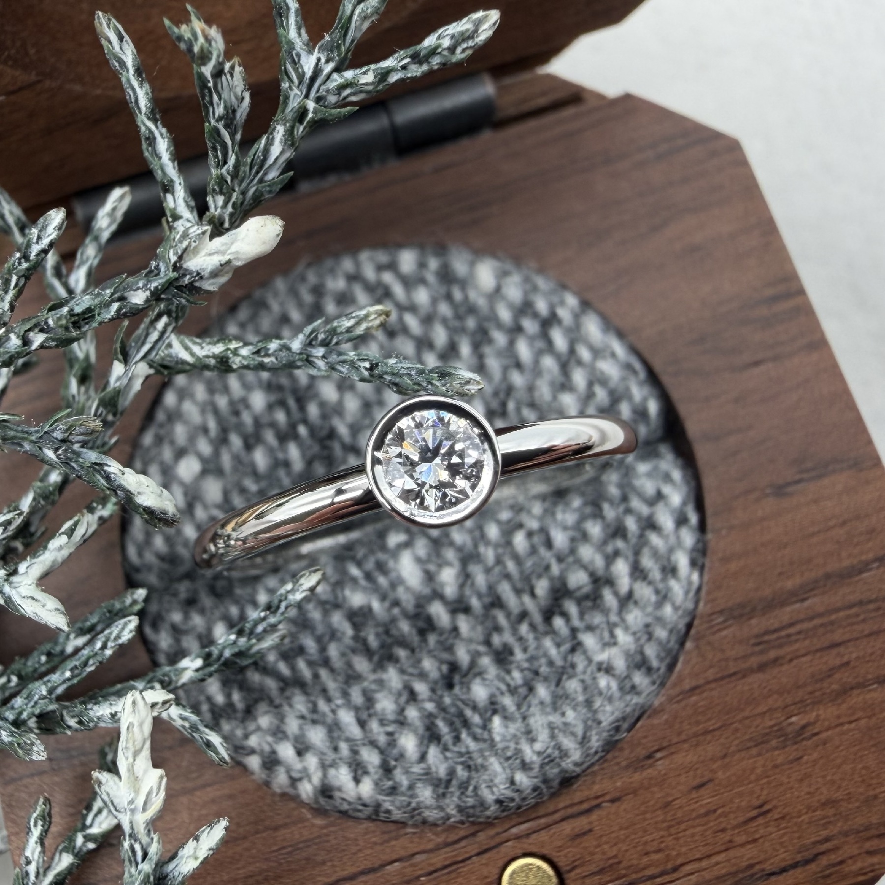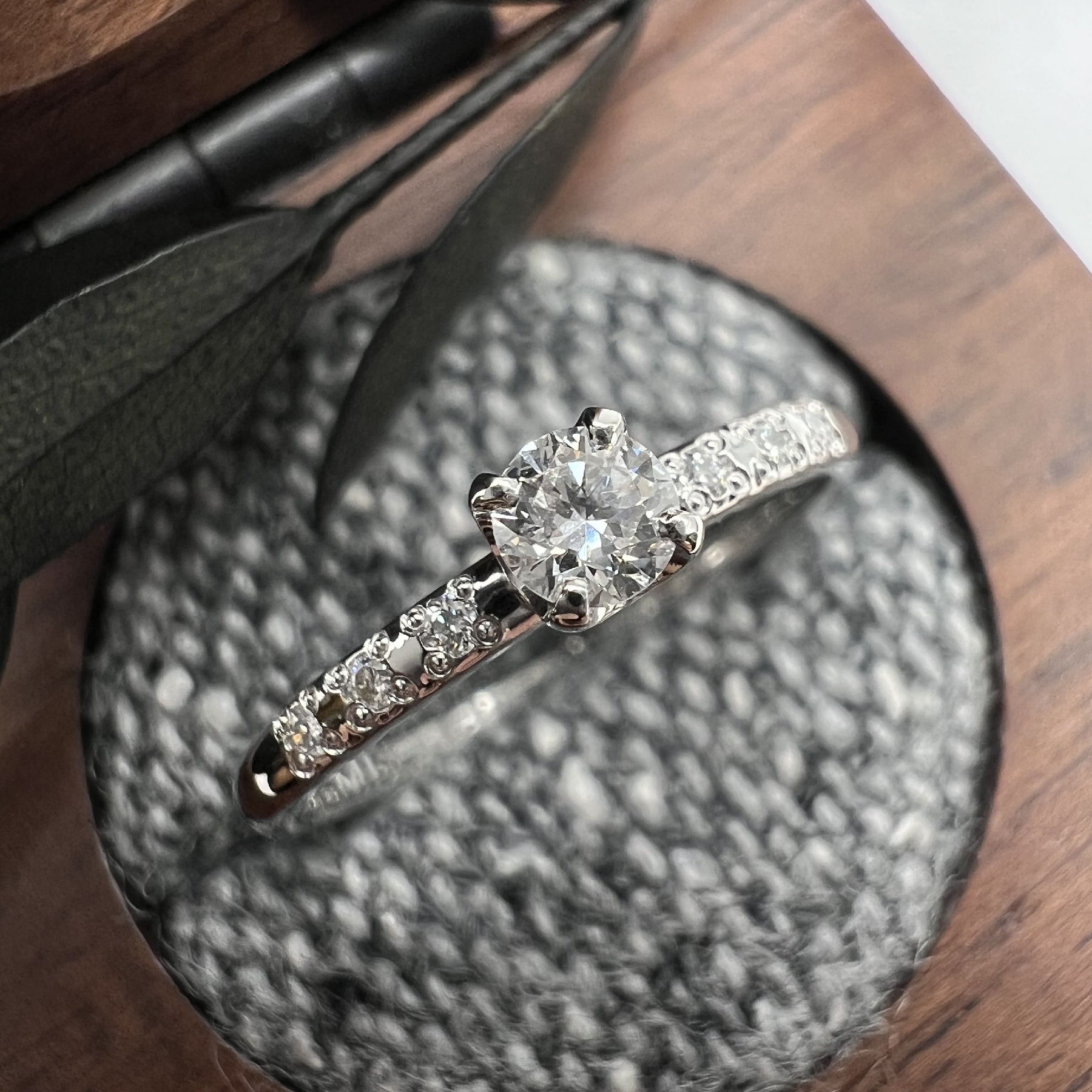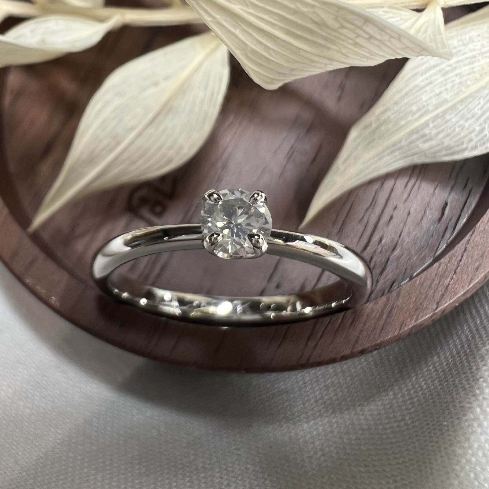 流行に左右されないデザインで、日常に馴染みやすい婚約指輪に仕上がります。単体で身につけるだけでなく、お気に入りの指輪との重ねづけもお楽しみください。