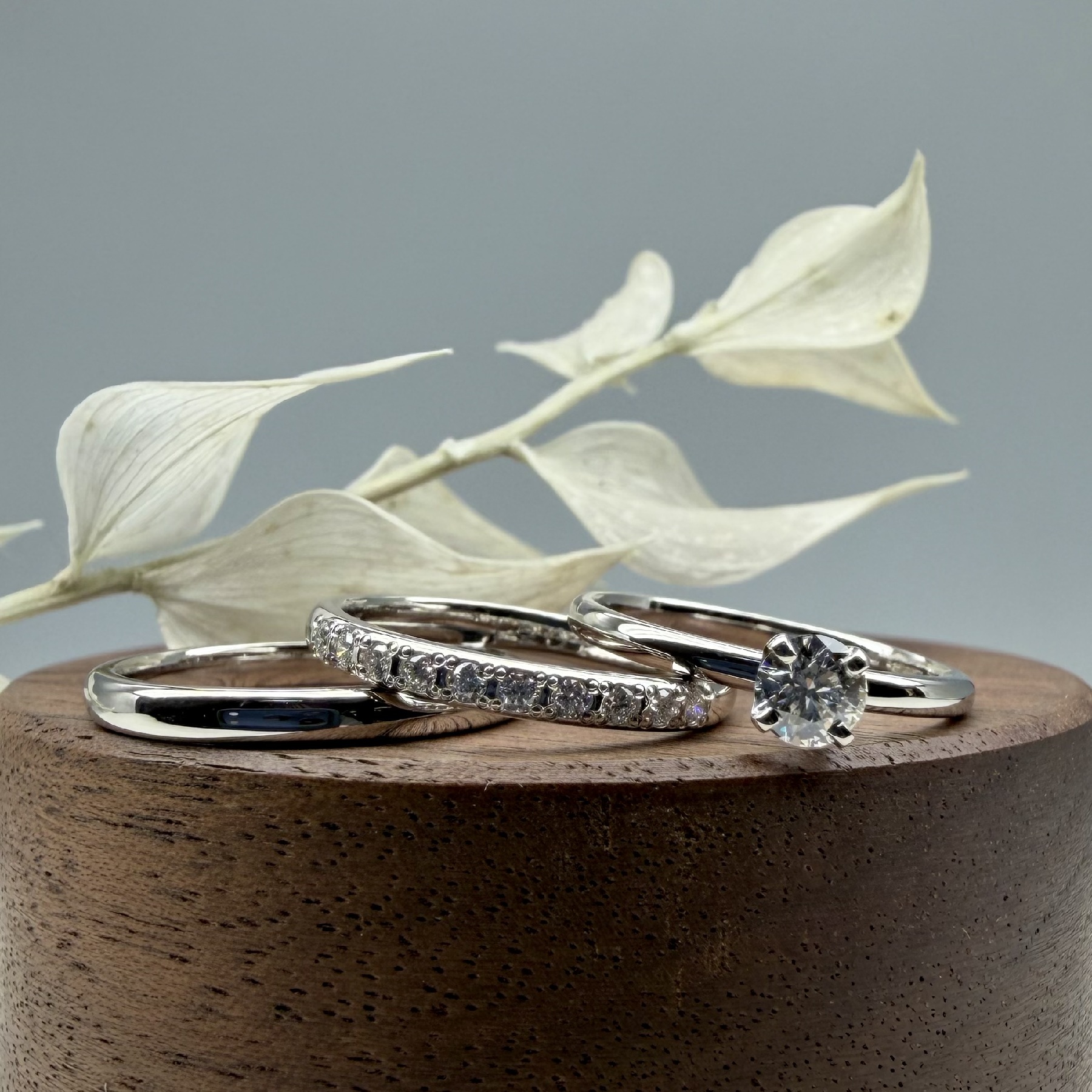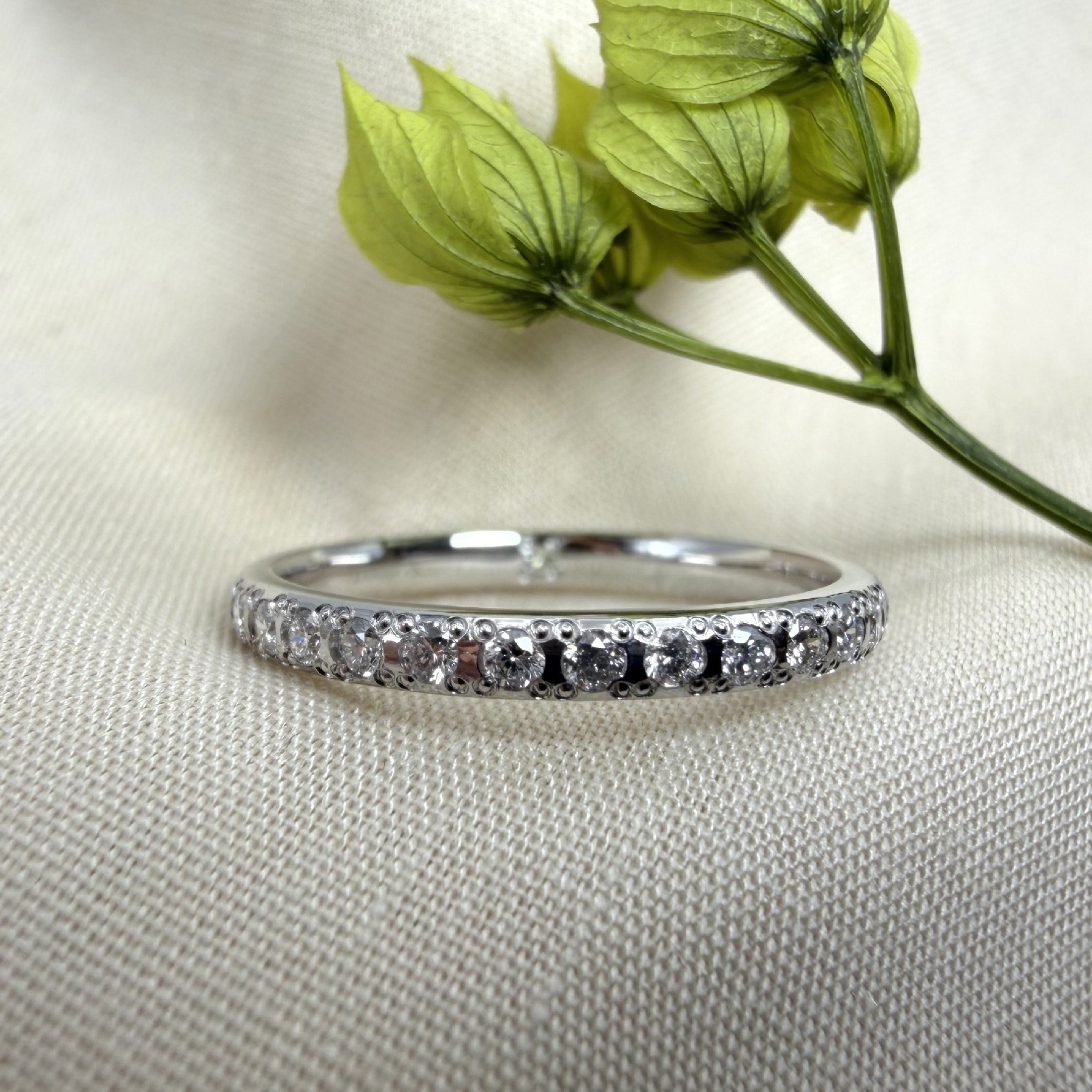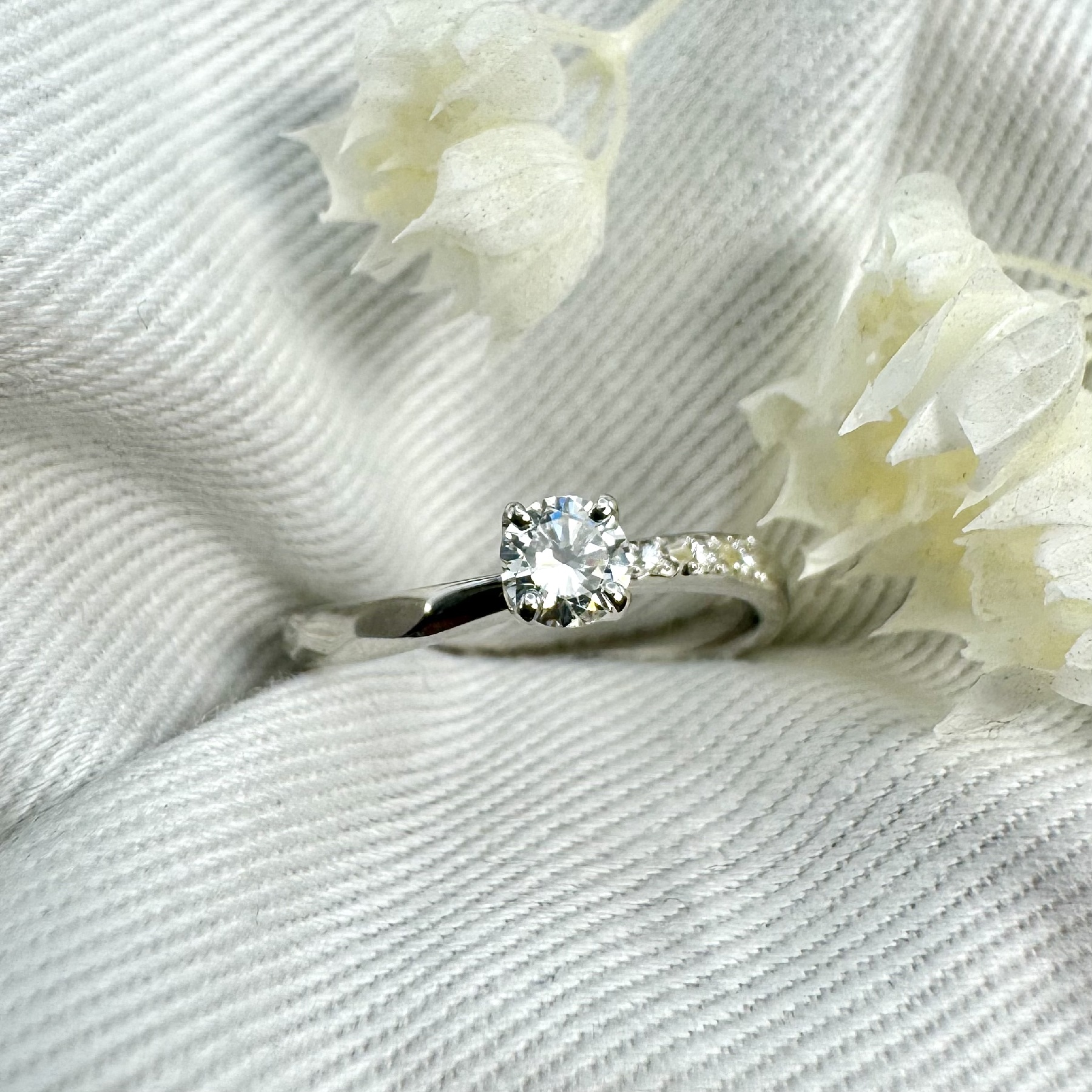 シャープな白い輝きが特徴の、ブライダルジュエリーの王道。変色に強く、普段使いしやすいことも魅力です。