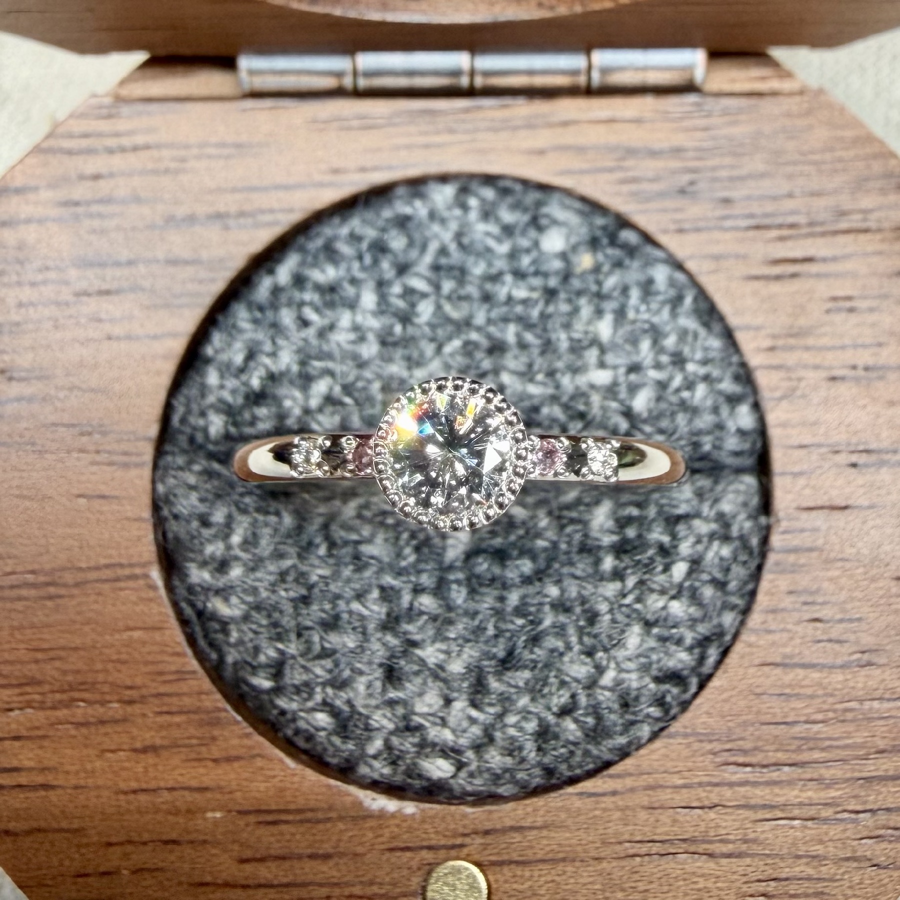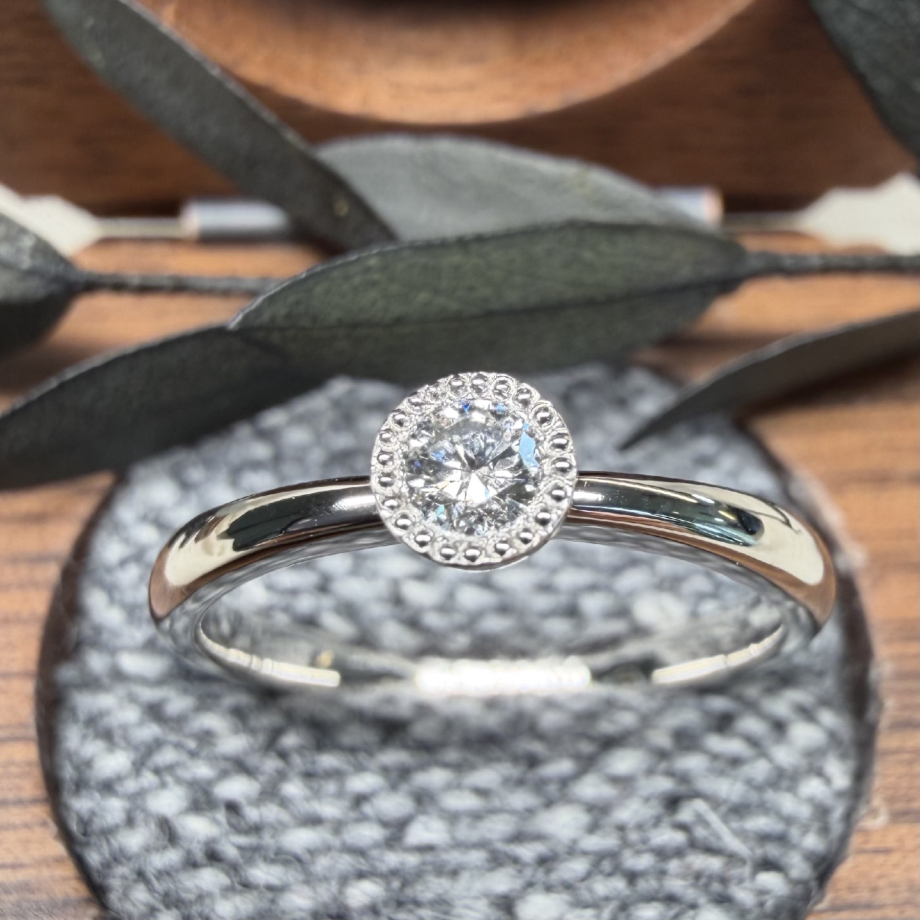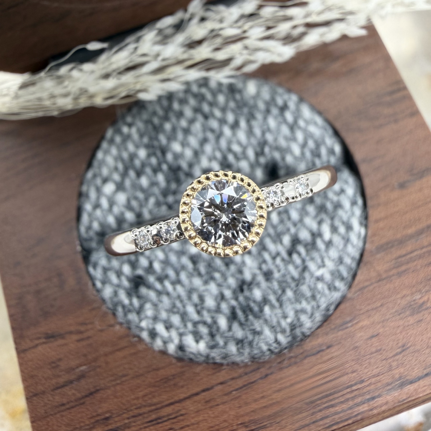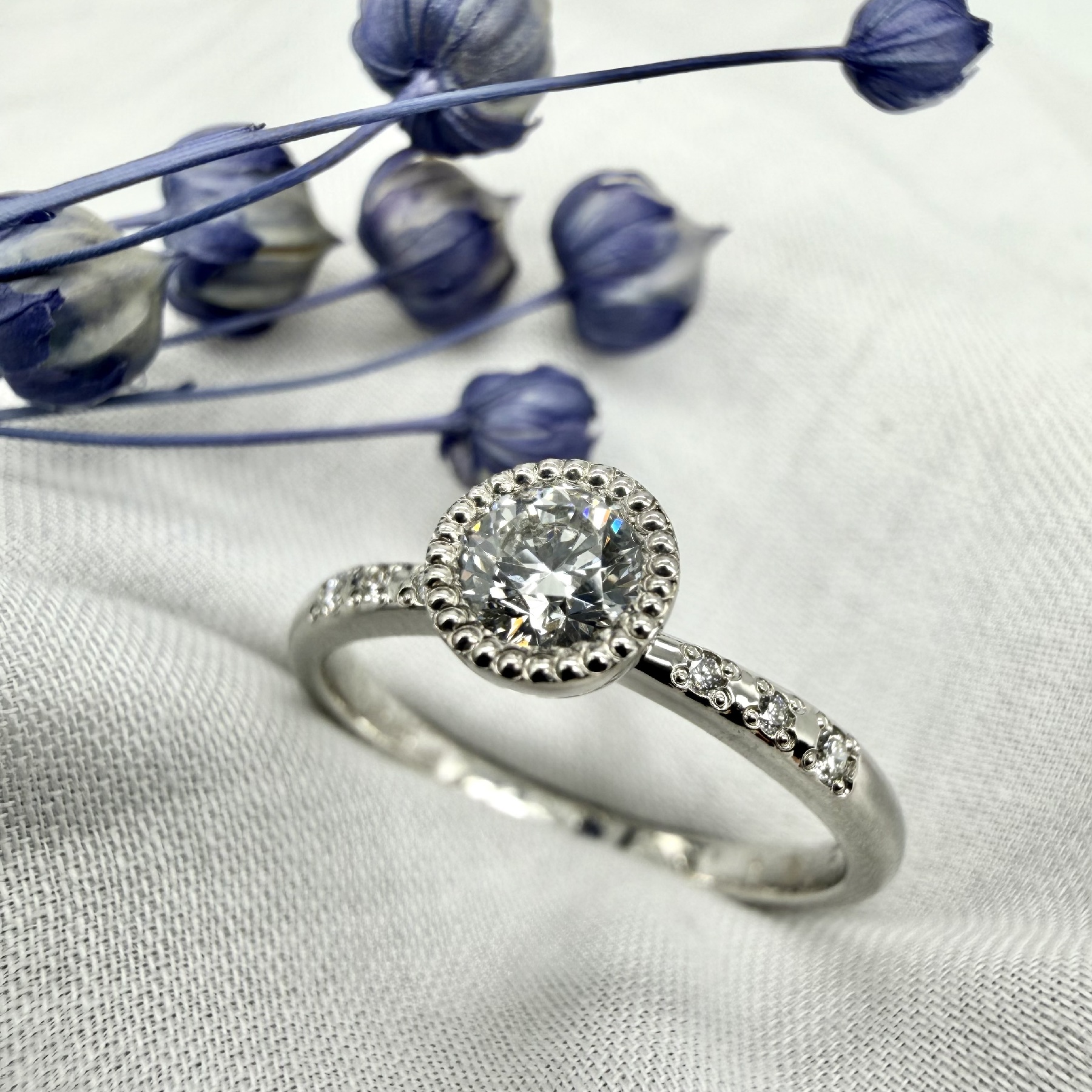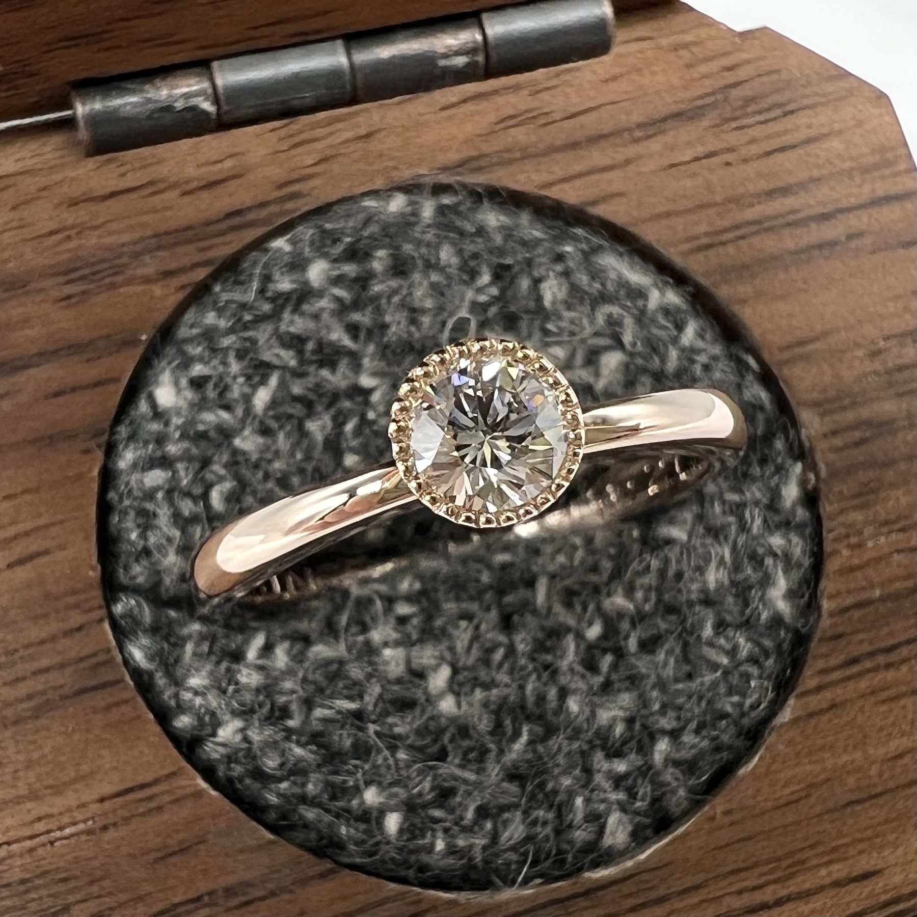 細かな玉模様を彫り入れたミル枠でダイヤを固定します。キュートでゴージャスな印象を与えてくれるデザインです。