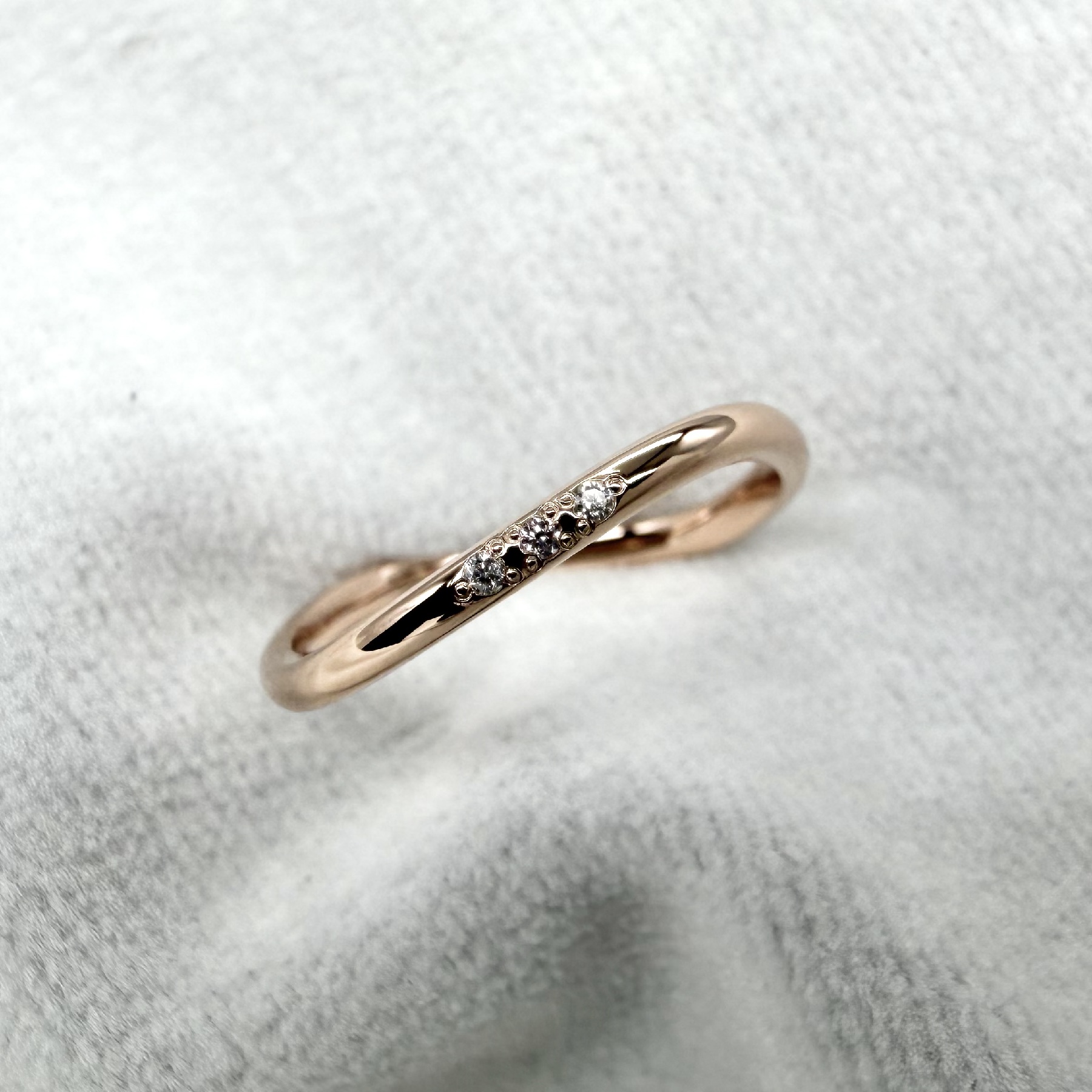 指輪の表面を鏡面のようにキラキラに磨き上げる王道の仕上げ。磨きの工程は大変ですが、その分達成感はひとしおです。
