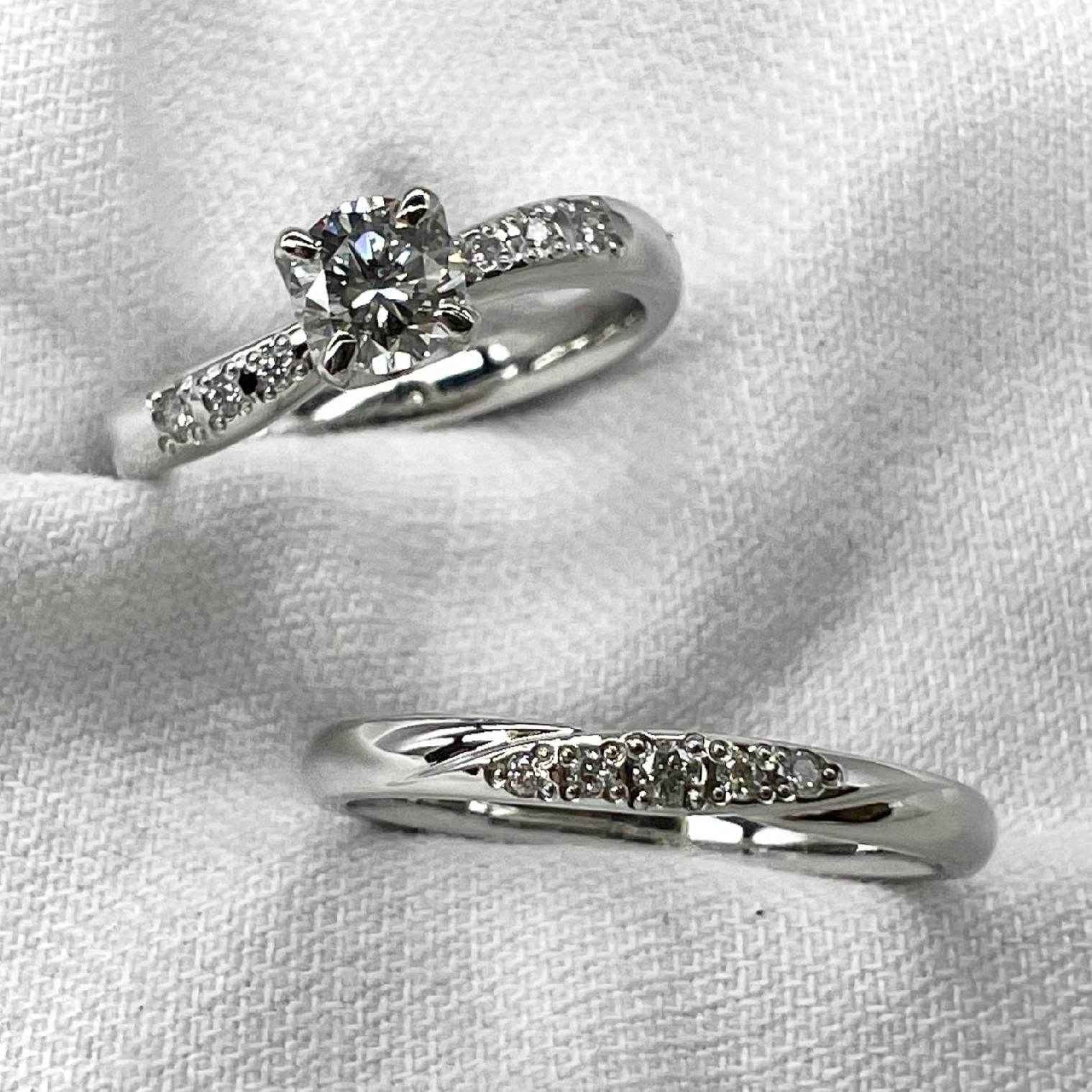 シャープな白い輝きが特徴の、ブライダルジュエリーの王道。変色に強く、普段使いしやすいことも魅力です。